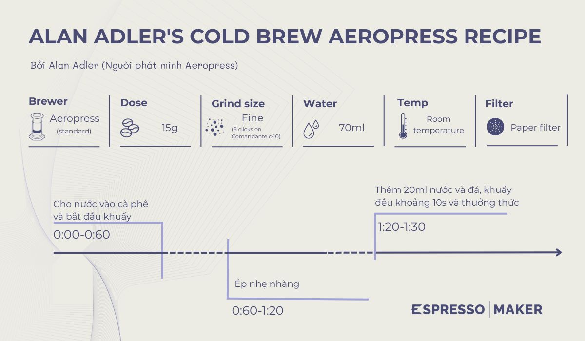 Mới đầu, mình khá bất ngờ với việc công thức không sử dụng nước nóng, và còn càng ngạc nhiên hơn khi tổng thời gian pha chỉ nhỉnh hơn 1 phút (bình thường, với việc pha bằng nước nóng thì mình cũng mất đến tầm 3 phút cho một bình cà phê), sự hoài nghi của mình cũng dần hạ xuống khi thấy cỡ xay được sử dụng rất mịn, và người đứng sau công thức chính là người phát minh ra Aeropress, dụng cụ sử dụng cho công thức này, nhưng chỉ là bớt đi thôi chứ sự hoài nghi trong mình vẫn còn:))