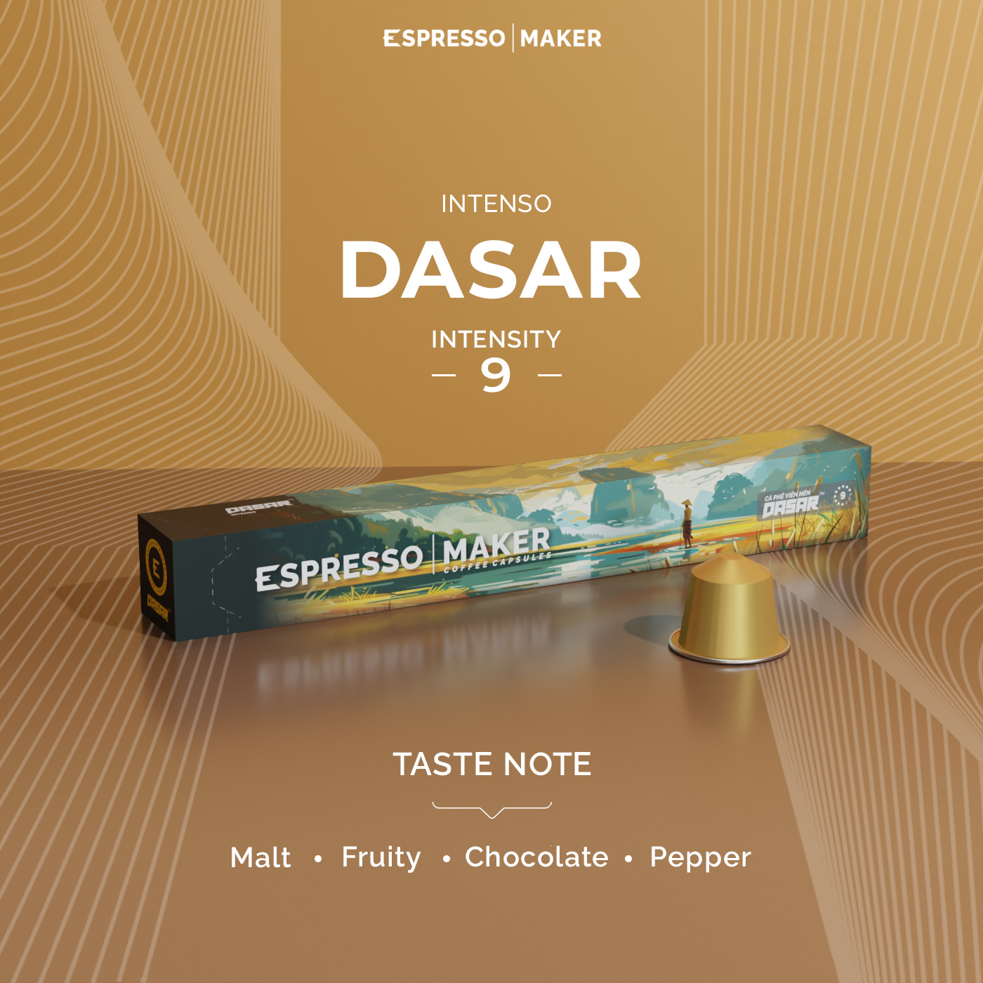 Sắc sảo và đầy chiều sâu – Dasar mở ra bằng trái cây tươi mát, mạch nha mượt mà, rồi kết thúc với chút cay của hạt tiêu. Cân bằng giữa năng lượng và sự phức tạp. Một loại cà phê viên nén đặc biệt bởi nó vừa đem đến những hương vị quen thuộc của một loại cà phê arabica Việt Nam nhưng đồng thời cũng rất mới là và đầy bất ngờ bởi sự hoà hợp khó tin giữa hương vị tươi sáng và tông tối đậm đà, mạnh mẽ.