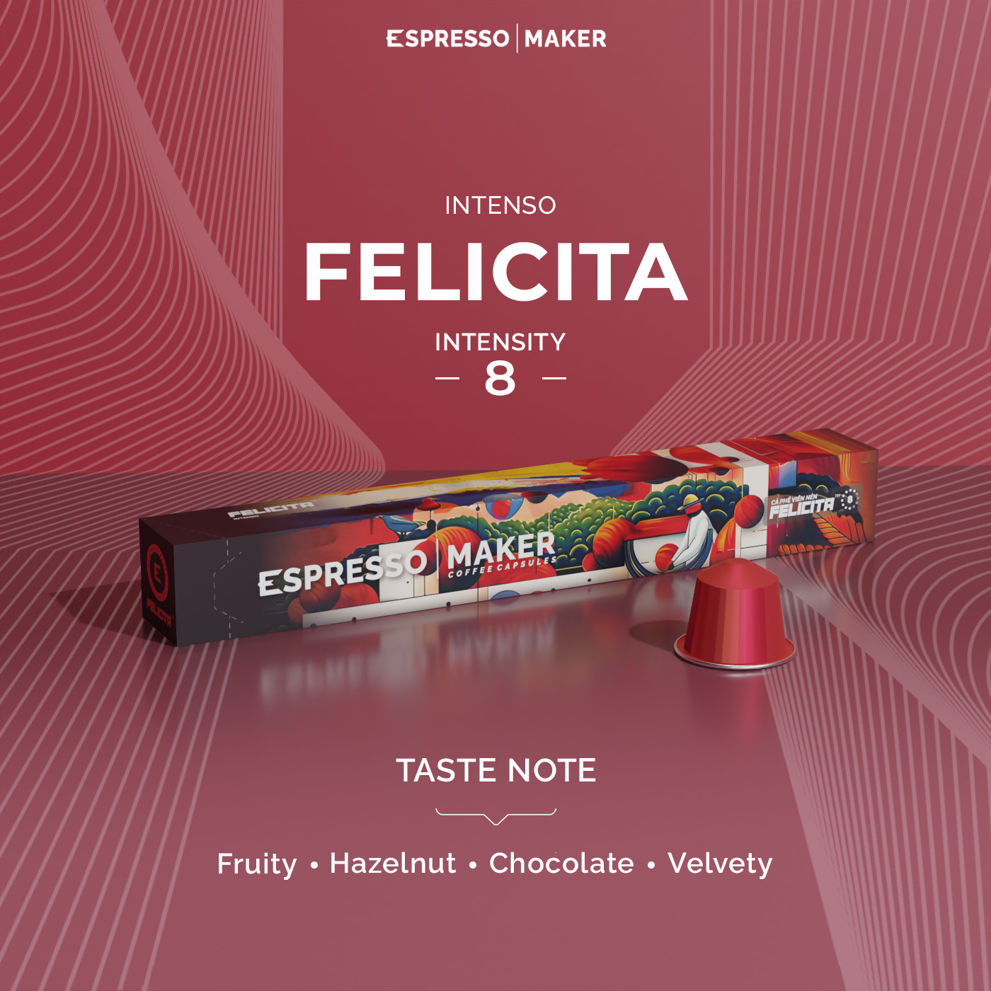 Felicita là một tách espresso êm dịu nhưng đầy niềm vui: trái cây tươi sáng, body mượt, hậu vị chocolate và hạt dẻ kéo dài. Một ly Felicita tuy không mang đến những hương vị bất ngờ nhưng lại ngọt ngào và hoà quyện đến xao xuyến. Một trải nghiệm thư giãn và đồng thời cũng là một lựa chọn "an toàn"