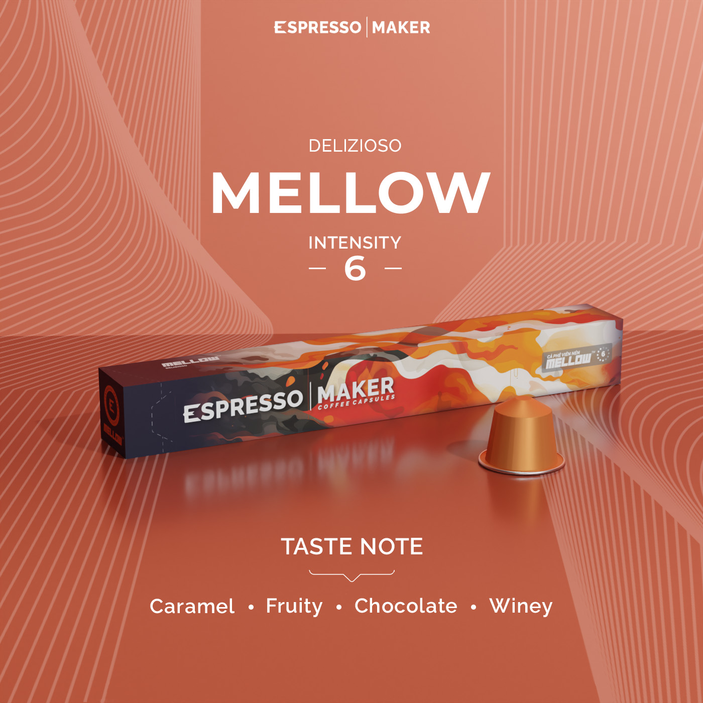 Mellow là sự kết hợp hoàn hảo giữa sự dịu dàng và phức tạp: vị trái cây lên men nhẹ, caramel ngọt ấm, chocolate mượt và chút hậu rượu vang sang trọng. Mellow đại diện cho một ly cà phê vừa thú vị nhưng cũng đầy mượt mà, êm ái. Từ một trong những trang trại để lại ấn tượng nhiều nhất cho đội ngũ Espressomaker bởi sự cẩn trọng trong sản xuất và chất lượng tuyệt vời, Mellow là viên nén cà phê mang lại niềm tự hào của Espressomaker về tiềm năng của cà phê đặc sản Việt Nam.