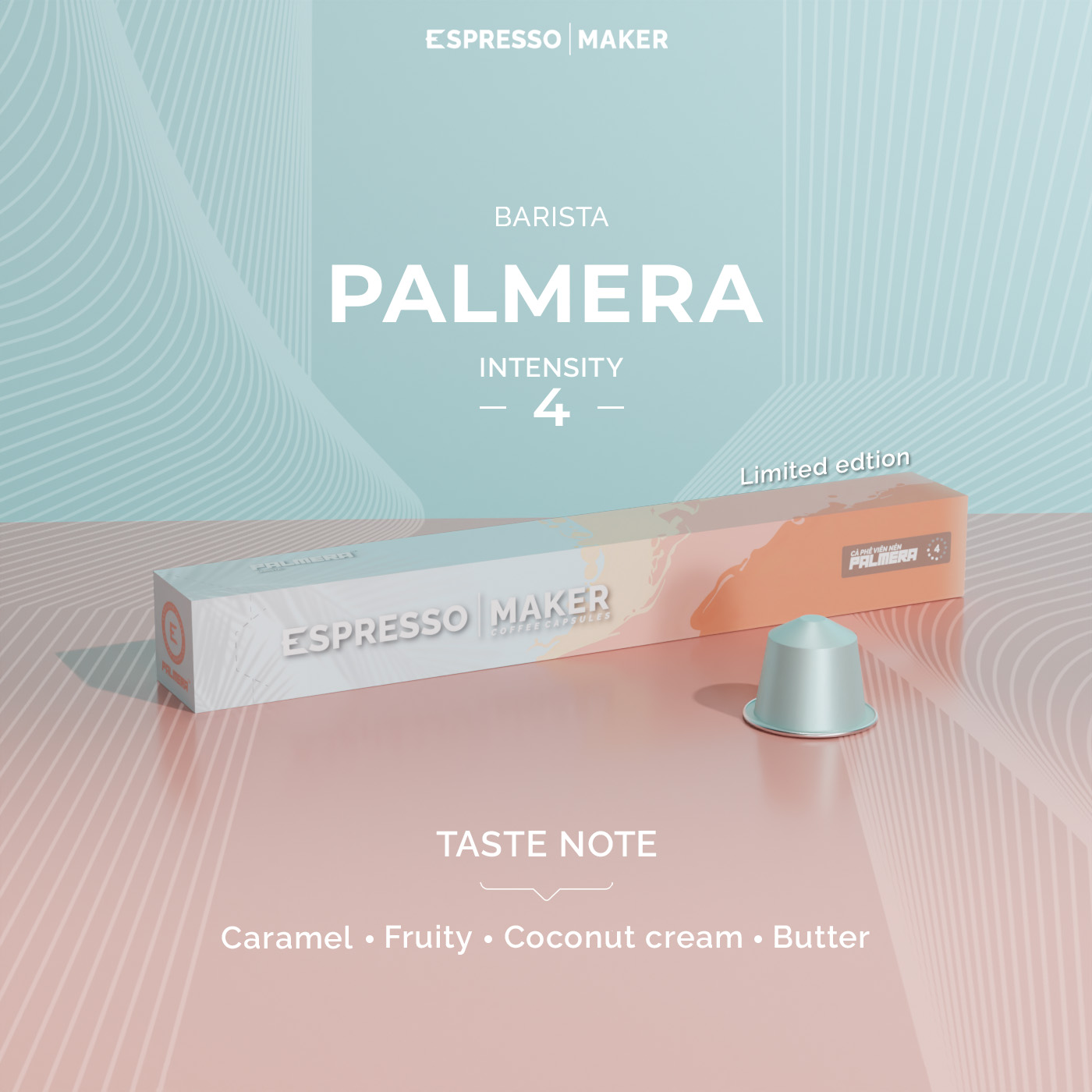 Palmera là một chuyến du hành đến bãi biển nhiệt đới – vị kem dừa ngậy béo kết hợp cùng caramel và trái cây tươi. Dành cho những tâm hồn khám phá và những ngày bạn cần một sự mới lạ cho ly cà phê thường nhật. Được tạo ra bằng sự sáng tạo không biên giới, cà phê viên nén Palmera mang đến trải nghiệm độc nhất, một sự ngọt ngào và béo ngậy không một loại cà phê nào có được.
