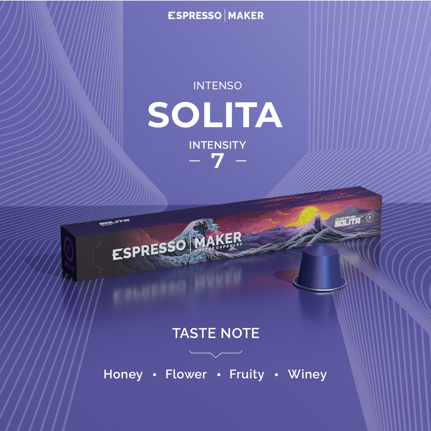 Solita là tinh thần rạng rỡ của Tây Bắc: vị hoa và trái cây sáng bừng, hậu vị mật ong và rượu vang sâu lắng. Một loại cà phê viên nén với hương vị tươi sáng và bùng nổ, đại diện cho sự đổi mới và sáng tạo trong phong trào cà phê đặc sản tại Việt Nam.