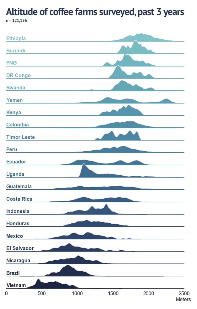 Càng ở trên cao thì càng lạnh, khí hậu lạnh khiến quả cà phê chín lâu hơn, qua đó tích luỹ được nhiều đường. Đường là nguồn dinh dưỡng tuyệt vời cho cây và quả cà phê để tạo ra những hương vị xuất sắc. Vì vậy mà độ cao luôn là một yếu tố quan trọng cho một loại cà phê chất lượng nhưng không phải cứ cao là sẽ trồng được cà phê. Một vùng trồng cà phê sẽ không thể bị sương gió quá nhiều hay việc ở trên cao sẽ dễ hứng quá nhiều nắng, trong khi bóng dâm cũng là một phần quan trọng trong những vùng trồng cà phê, vậy nên diện tích trên cao trồng được cà phê luôn rất hạn chế, đó cũng là một phần lý do khiến những loại cà phê chất lượng cao có giá đắt.