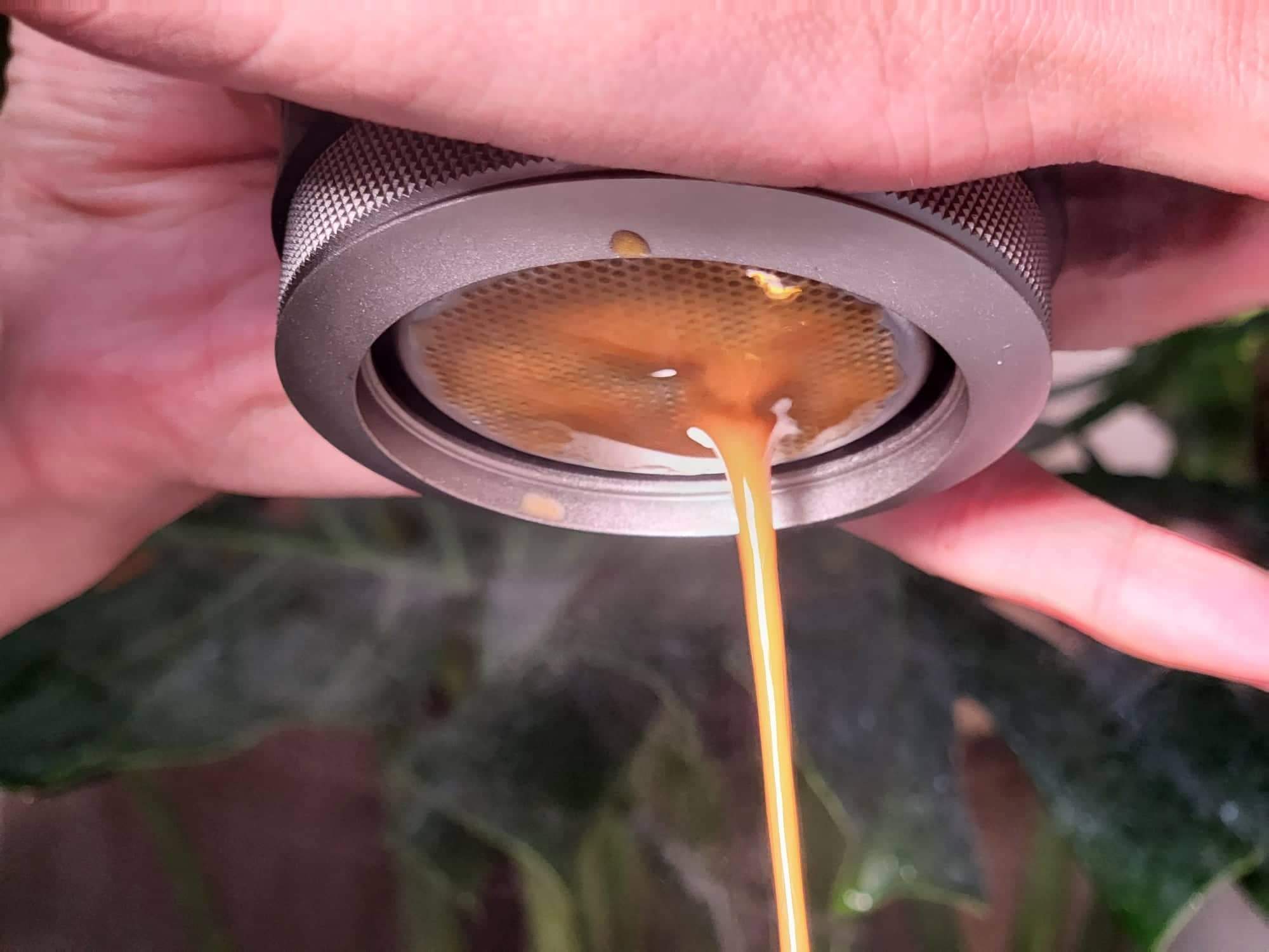 Khi cà phê bắt đầu ra, bóp nhanh dần nhưng không quá nhanh, cốt yếu là giữ dòng chảy luôn ra đều đặn. Việc bóp quá nhanh sẽ tạo ra áp suất lớn đột ngột ảnh hưởng xấu đến cấu trúc của lớp cà phê.