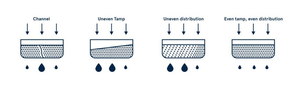 Channeling tức “kênh lưu dẫn” là từ khoá được nhắc đến rất nhiều nhất về những vấn đề trong việc pha chế một ly espresso. Để ngắn gọn và dễ hiểu nhất thì channeling là hiện tượng nước không ngấm đều vào tất cả các phần cà phê, thay vào đó thì nước sẽ đào những kênh nhỏ khiến việc chiết xuất không đều. Những phần bị nước đục qua thường sẽ bị chiết xuất quá “Over-extracted” và những phần không được nước ngấm đến lại bị chiết xuất thiếu “Under-extracted”, điều này khiến shot espresso của bạn thường có hương vị thiếu cân bằng, ly cà phê sẽ bị đắng hoặc chua quá, mất đi những hương vị tốt đẹp nhất của hạt cà phê.